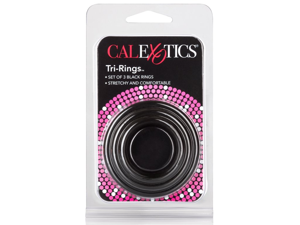 Set 3 Black Cockrings značky CalExotics obsahuje tri penisové krúžky s rôznymi priemermi, čo umožňuje výber vhodnej veľkosti podľa individuálnych preferencií.