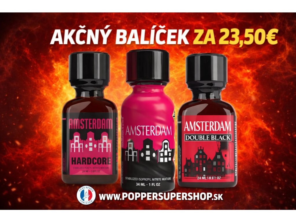 Výhodný akčný balíček troch poppers produktov AMSTERDAM v rôznych objemoch.