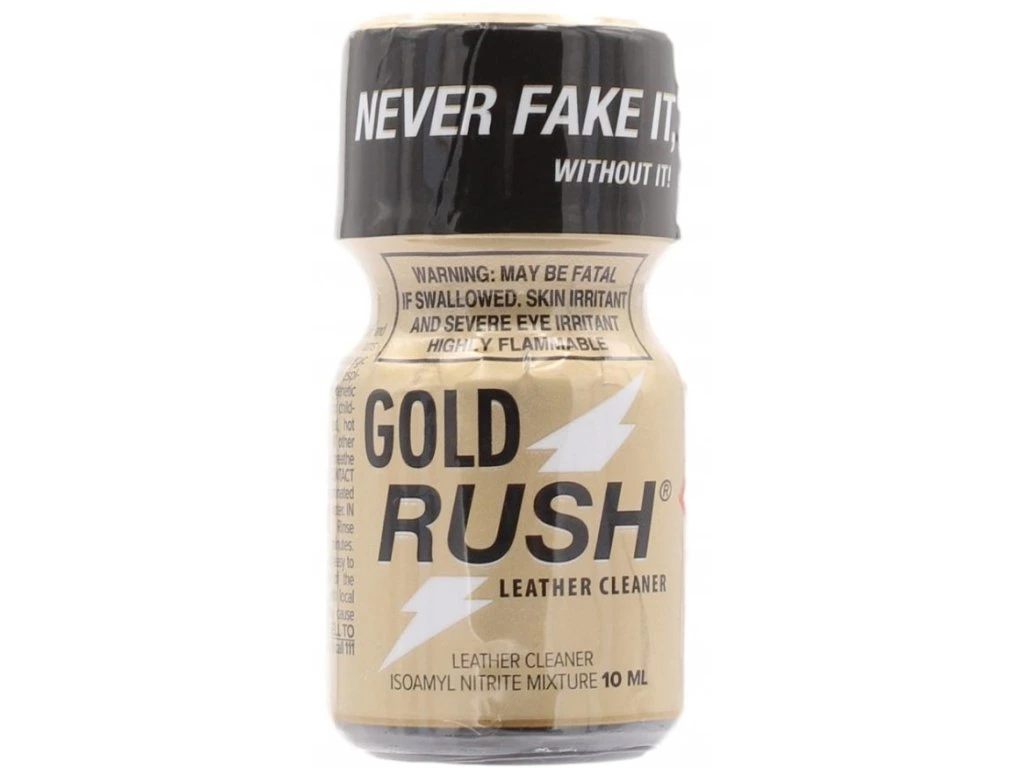 Poppers GOLD RUSH 10 ml v kompaktnom balení. Určený výhradne na technické účely.